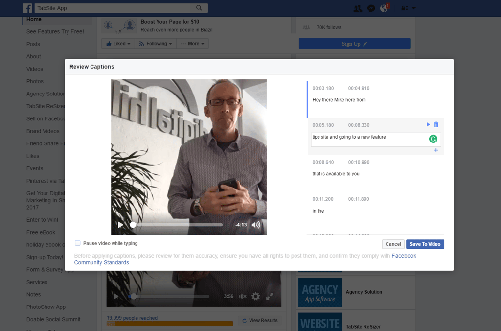 While auto-captioning is very effective, it doesn’t always get everything right on the first try. So Facebook gives you a simple way to edit, line by line, the transcription of the video. Generally, Facebook does a solid job transcribing and it can be from 75-95% correct from the start!