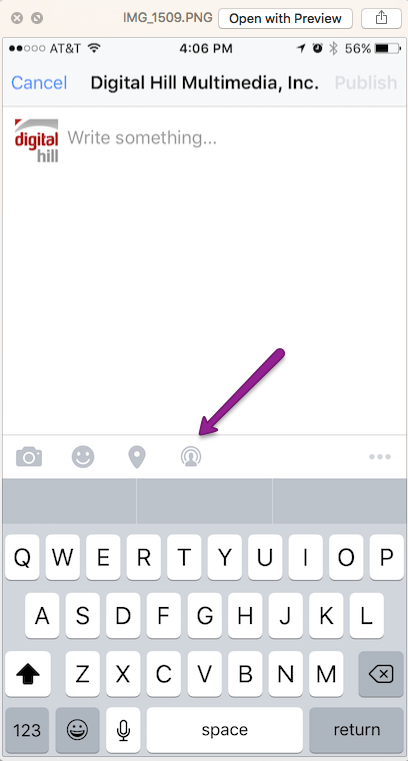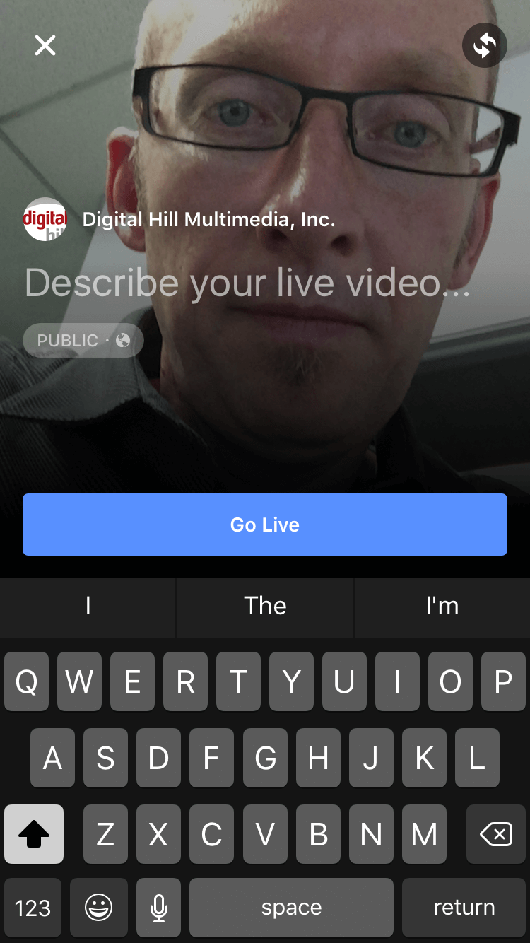 Select the “Live Video” icon to the right of the Place icon, allow it access (first time), and then type in a introductory message for your stream.