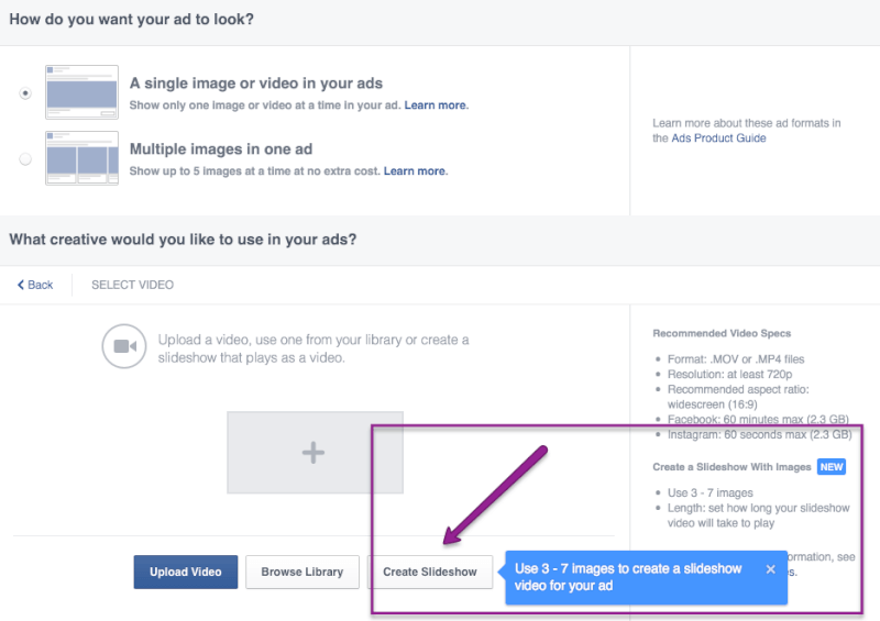 These ads carry some visual “POW!” with them! Not available when you Boost a post, these ads can generate traction and capture the eye of the viewer on Facebook. The Video Collage allows you to upload a number of images and Facebook combines them to make video out of it. The power is that the video is native to Facebook with all the benefits including auto-play in the news feed and more reach.