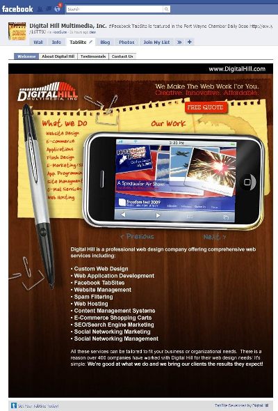 As a communication tool, Facebook is great for building brand awareness, growing a fan base, and building relationships. As a conversion platform, Facebook has had limited capacity due to Facebook enforced protocols. However, this has been changing over the last 12 months with the proliferation of custom applications that enable businesses to enact and utilize more standard methods of conversion conventions. Now, with the launch of a Facebook TabSite by Digital Hill Multimedia, these barriers to conversions are gone!