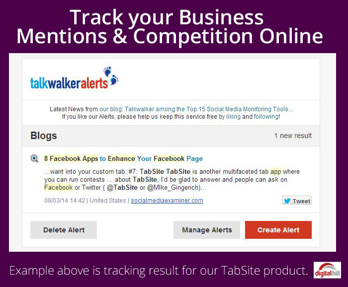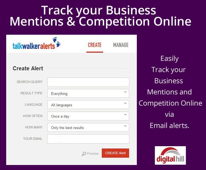 The best part about this tool? It’s free! Simply go to www.talkwalker.com/alerts to setup your keyword terms for tracking. Experiment with the frequency and keyword phrases over a few day time period and you can then find the type and amount that is helpful for your business.