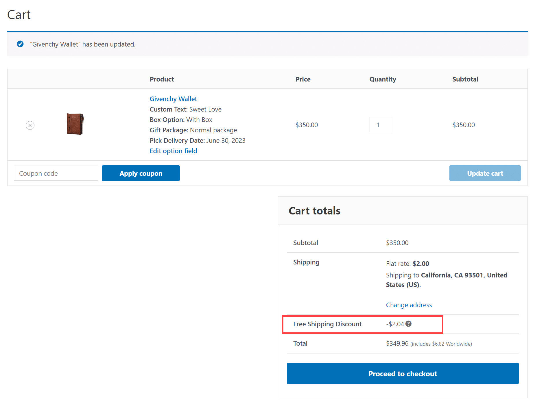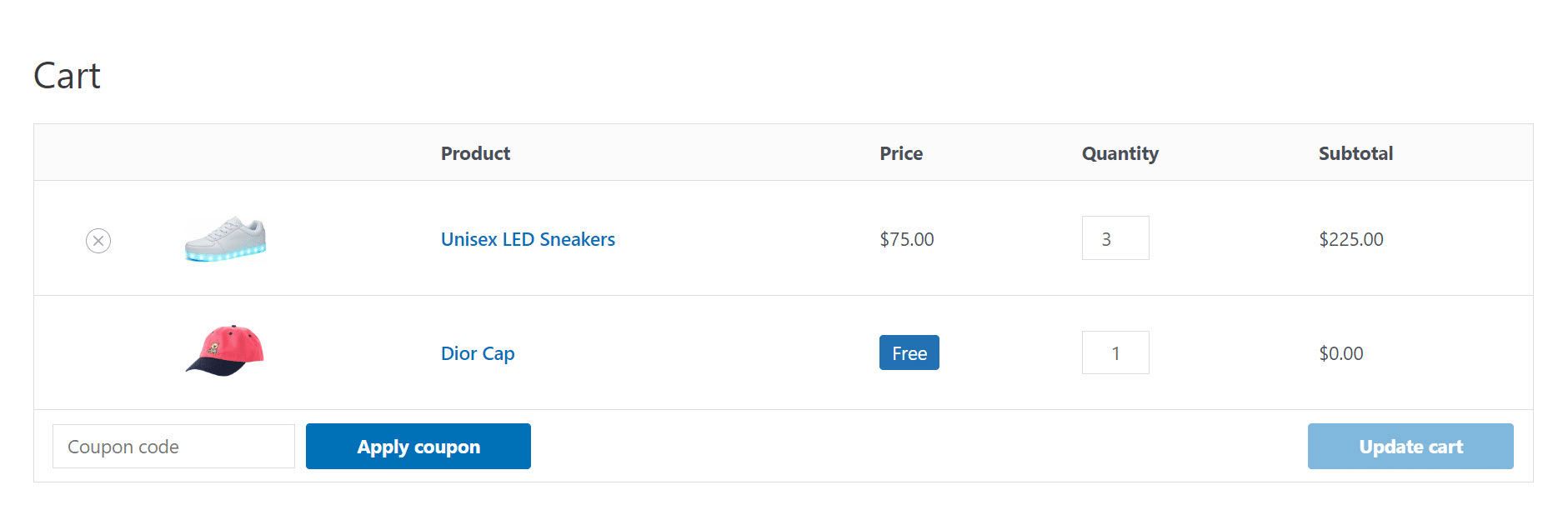 From the list of available free gift products, the item will update in the cart accordingly. Also, the price for the free gift products will show as Free automatically.