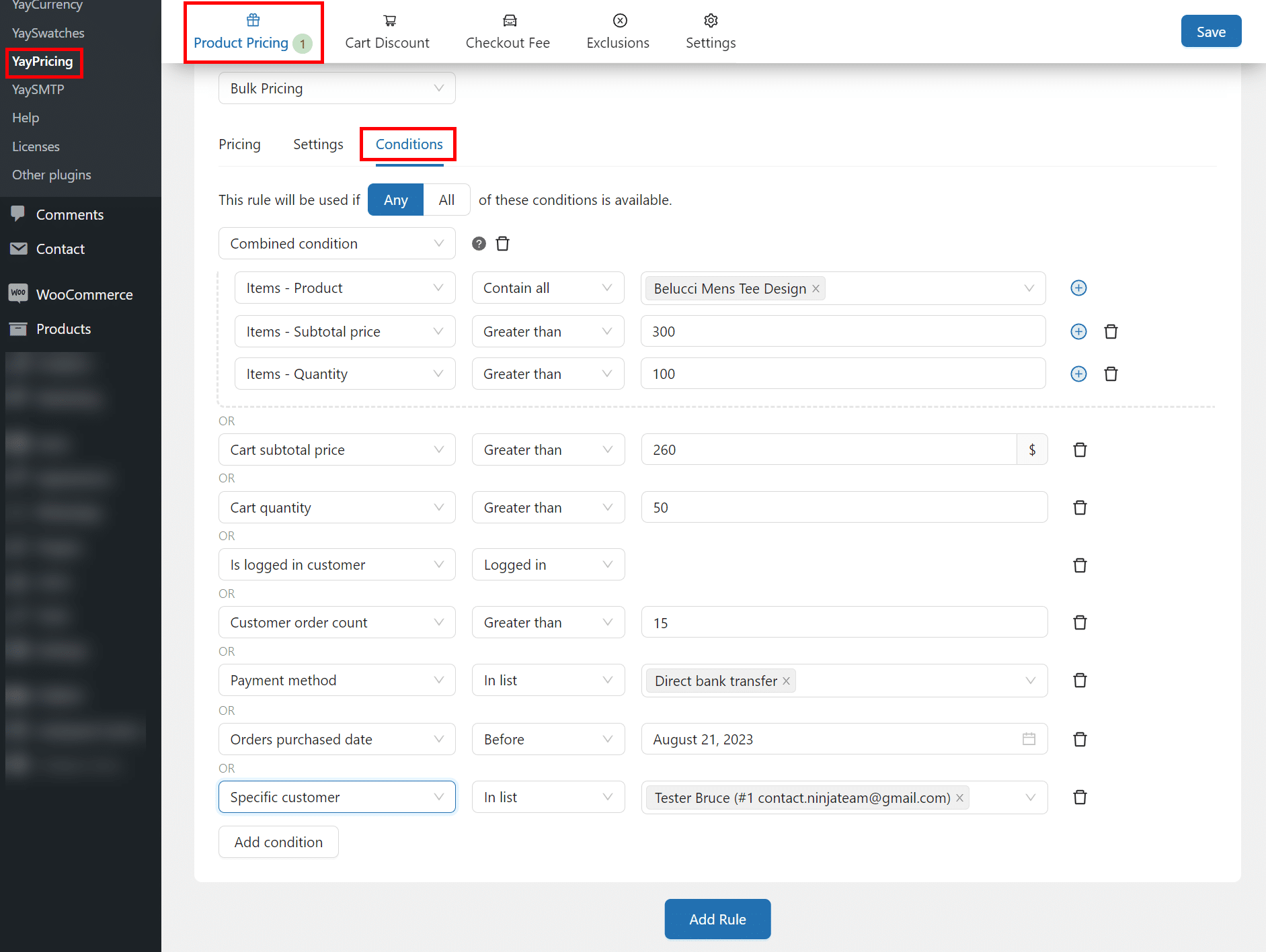 - Exclusions: YayPricing helps with setting up exclusion rules. Decide which products remain unaffected by your pricing rules. Or, safeguard specific rules from the influence of coupon codes. This ensures a finely-tuned approach to WooCommerce dynamic pricing.
