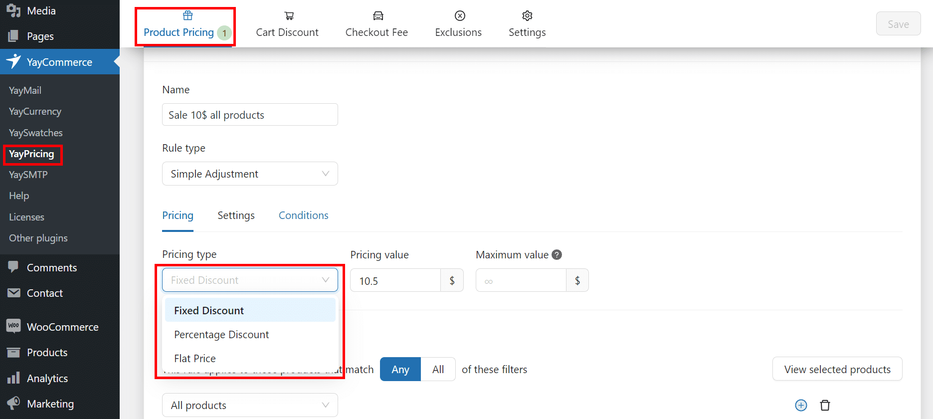 - Product Pricing: This tab helps you tailor product pricing rules that wield the power to influence product prices. Whether you’re looking to introduce new price points, establish product fees, or entice customers with irresistible discounts, this feature puts you in control.