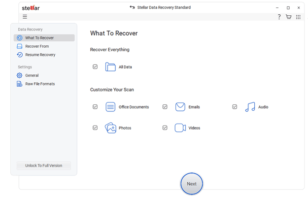 - Launch the software and select the type of data you want to recover (documents, photos, videos, etc.).